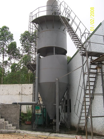 本工程采用XP型復(fù)合旋風(fēng)噴霧除塵器進(jìn)行凈化處理。工藝原理如下:拋光廢氣經(jīng)排氣罩、排風(fēng)總管收集經(jīng)引風(fēng)機(jī)的抽吸作用,廢氣以大于20m/s的風(fēng)速切線進(jìn)入復(fù)合旋風(fēng)噴霧除塵器。在旋風(fēng)除塵段,廢氣將由直線運(yùn)動(dòng)變?yōu)閳A周運(yùn)動(dòng),沿器壁自圓筒體呈螺旋形向下,朝錐形流動(dòng),含塵氣體在旋轉(zhuǎn)過(guò)程中產(chǎn)生離心力,將密度大于氣體的處理甩向器壁。塵粒一旦與器壁接觸,便失去慣性力而靠入口速度的動(dòng)量和向下的重力沿壁面下落,進(jìn)入排灰管。旋轉(zhuǎn)下降的外旋氣流在到達(dá)錐體時(shí),因圓錐形的收縮而向除塵器中心靠攏。當(dāng)氣流到達(dá)錐體下端某 一位置時(shí),即以同樣的旋轉(zhuǎn)方向從旋風(fēng)除塵器中部,由上而下繼續(xù)做螺旋形流動(dòng),經(jīng)中心排氣筒上升進(jìn)入噴霧段。氣流在噴霧段先后經(jīng)擋水板、換向板及分布板的整流后在塔內(nèi)均勻上升,噴霧系統(tǒng)噴曬下來(lái)的噴滴接觸,氣體中的5-10μm以下的粉塵被水濕潤(rùn)后增重落下而從斜底板沖出進(jìn)入循環(huán)池。凈化氣體經(jīng)雙折板式高效除霧器除霧后由排氣筒高空排放。